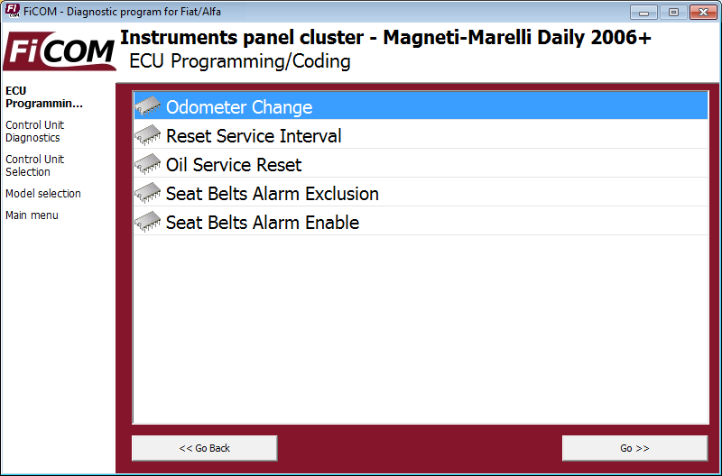 Funkci „Změna počítadla kilometrů“ lze nalézt v nabídce „Programování/Kódování ECU“ po připojení k řídicí jednotce sdruženého panelu přístrojů.