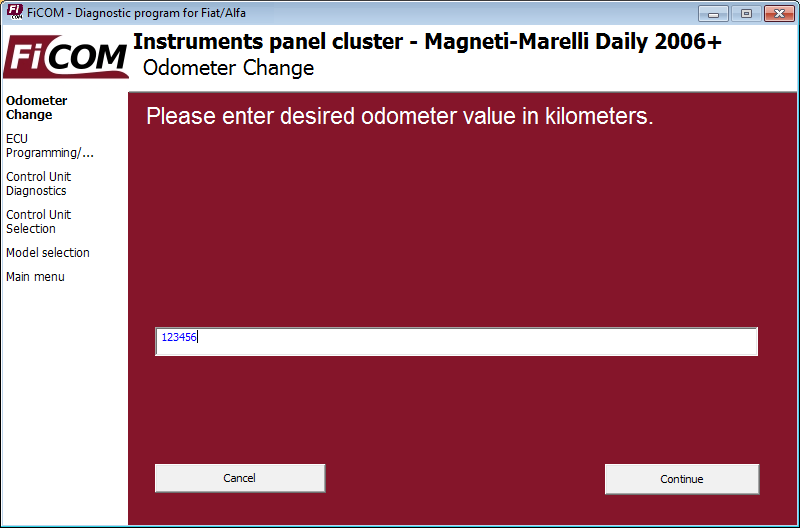 Budete vyzváni k zadání požadované hodnoty (v km), kterou chcete nastavit do počítadla kilometrů. Poté stiskněte „Pokračovat“ pro dokončení operace kódování.