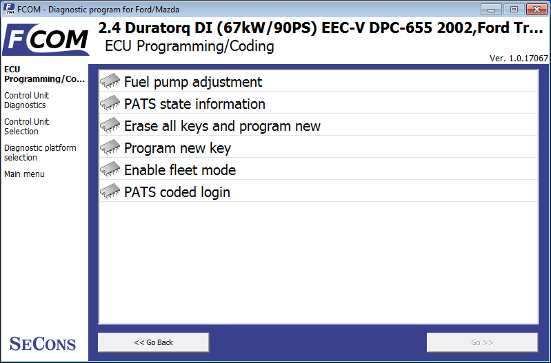 Funkce PATS jsou dostupné v diagnostické relaci pro PCM a IPC ECU v nabídce programování/kódování. Pro uživatele obeznámené s diagnostikou Ford IDS jsme pro srovnání přidali snímky obrazovky Ford IDS.