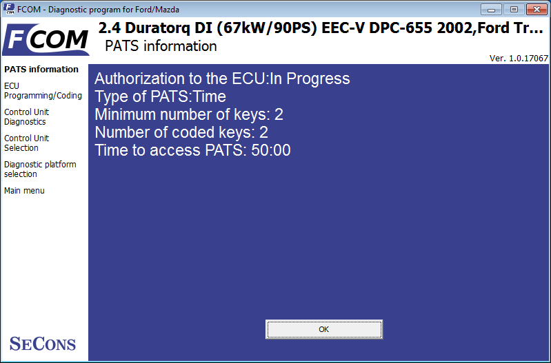 U vozidel, která používají více ECU pro systém PATS (např. PCM a IPC, BCM RKE nebo SCIL), musí ECU obsahovat stejná bezpečnostní data vozidla. Pro tento účel FCOM poskytuje funkci “PATS Pairing”, která je dostupná v kódovacím menu non-PCM ECU (IPC, BCM, SCIL nebo RKE). Funkce je dostupná pouze u kódovaných PATS.