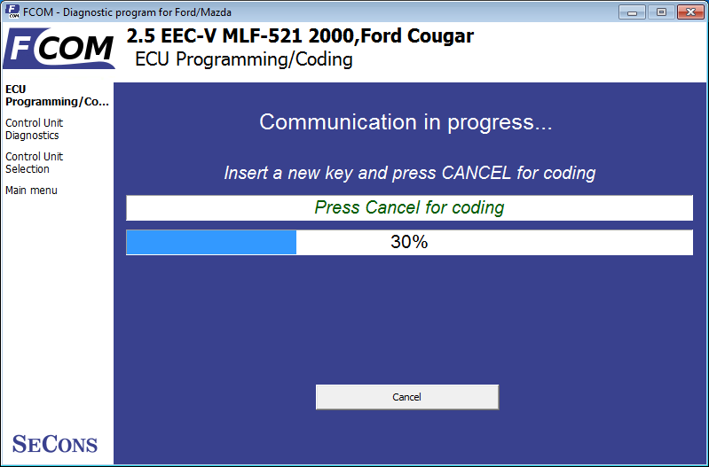 Poté stisknutím tlačítka //Cancel// spusťte proces kódování. Pokud vyměňujete klíč, zapalování nesmí být vypnuto déle než 10 sekund.