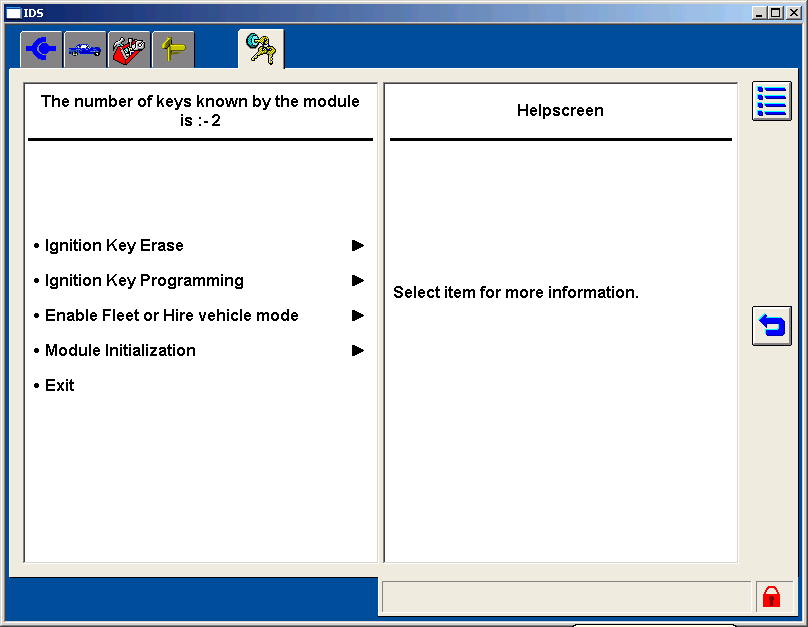Tato funkce zobrazuje všechny důležité informace o systému PATS a jeho stavu. Ford IDS tuto funkci neposkytuje.
